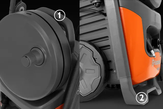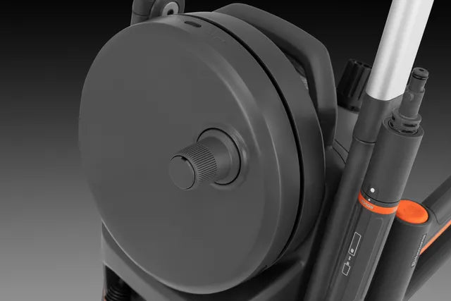Designed with convenient onboard storage so you have everything you need within easy reach. The PW 360 is compatible with several accessories, and to easily get the optimal setup for each task, nozzle and pressure guides are available on the washer. When the job is finished, roll-up is done quickly using the hose reel with support guide, providing efficient hose storage. The pressure washer also features large soft tread wheels for great traction in demanding terrain, low force trigger gun, and foldable aluminum handle to reduce the space needed for storage.